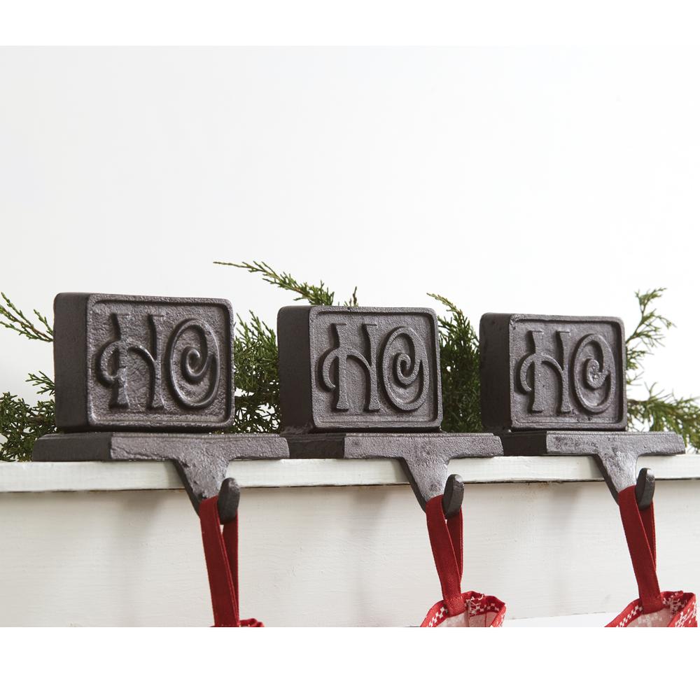 Give your mantel a rustic touch this holiday season with our Set of Three Cast Iron Ho Ho Ho Stocking Holders. Holds a normal sized stocking.