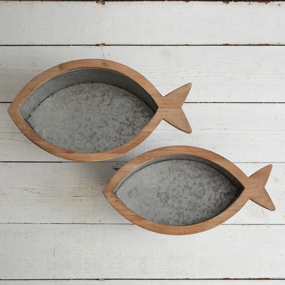 The Southport Galvanized Fish Bins come as a set of two. The large measures 15½''W x 9''D x 4½''H and the small measures 4½''H x 7½''D x 4''H. They are made out of galvanized metal and have a wood fish cutout design on top.